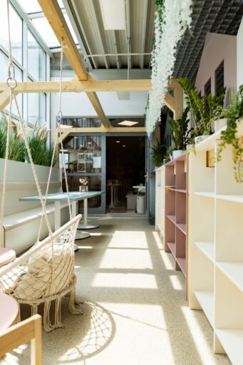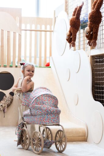 Rodzinna kawiarnia z naturalną bawialnią, która nie dostarcza dziecku nadmiernych bodźców, a swą prostotą i estetyką zachęca do radosnej, wartościowej zabawy. W tym czasie rodzice mogą zrelaksować się przy kawie czy ciastku w wyodrębnionej dla rodzica strefie kawiarnianej. Do sali przynależy również strefa gimnastyczna, w której odbywają się różnorodne zajęcia dla dzieci od 0-12 lat zapewniające pożądaną dla rozwoju dziecka stymulację oraz masę doświadczeń sensorycznych. W godzinach wolnych od zajęć – druga sala do zabawy dostępna jest w cenie standardowego biletu.